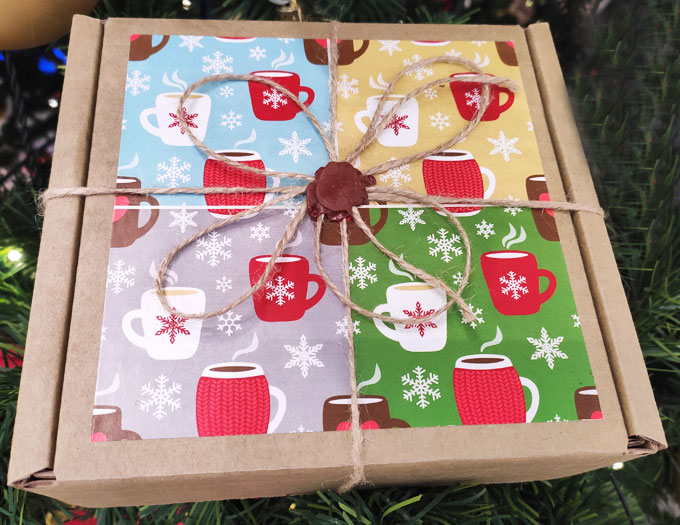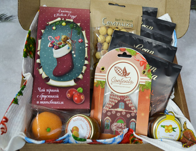 Оригинальный подарок на Новый год с брусничным чаем, натуральным молотый кофе с разными вкусами в удобных пакетиках, хрустящими орешками, мандарином из марципана, 2 баночек конфитюров и милого полотенца (для кухни) с новогодним рисунком.